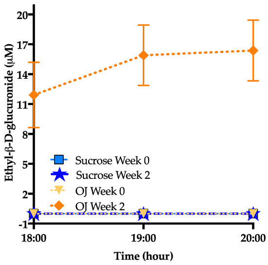As shown in Figure 7 ethyl-β-d-glucuronide, a metabolite of alcohol consumption [38] was elevated only in participants consuming OJ (+11.9 ± 3.3, p < 0.0001) but was undetected in those consuming sucrose-SB; (p = 0.001 between groups). This metabolite was undetected among38st all participants at baseline.
