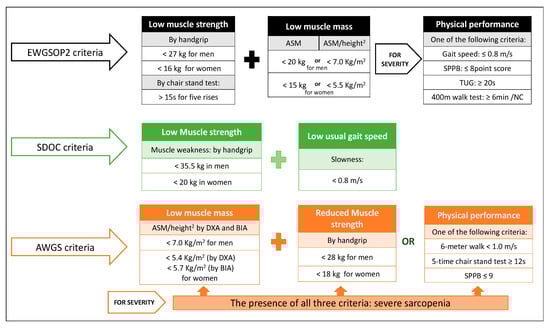 Finally, the AWGS, in its 2019 consensus update, maintains the original definition of sarcopenia as an age-related loss of skeletal muscle mass accompanied by low muscle strength and/or physical performance []. The presence of all three criteria corresponds to severe sarcopenia (Figure 1).