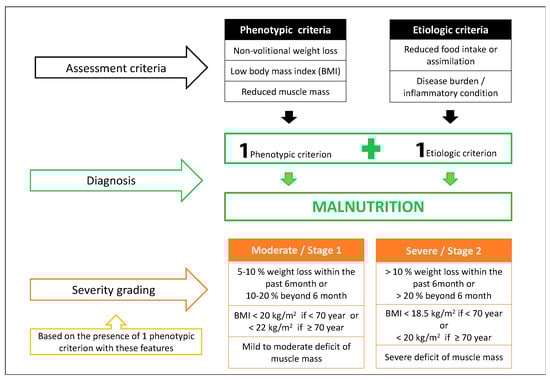 Given the lack of a worldwide consensus on diagnostic criteria, together with new evidence supporting the influence of disease and inflammation on malnutrition, the Global Leadership Initiative on Malnutrition (GLIM) engaged the majority of nutrition societies in an effort to standardize the diagnosis of malnutrition in clinical settings [,]. The GLIM proposes a three-step approach: First, patients must be identified by a validated screening tool; second, malnutrition requires the presence of at least one phenotypical criterion and one etiological criterion; and finally, severity is based on threshold levels of the phenotypic criteria (Figure 2).