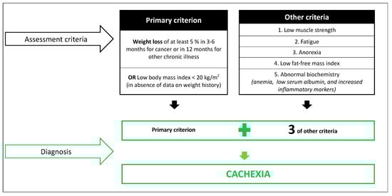 Cachexia is a common manifestation of several serious illnesses, such as chronic heart failure, acquired immune deficiency syndrome, and cancer []. Cachexia and, more specifically, cancer cachexia is a type of disease-related malnutrition associated with chronic inflammation, which should not be perceived as end-stage malnutrition []. Reaching a single definition with specific diagnostic criteria is still a challenge for the scientific community [,,,]. One of the first successful attempts was achieved in the Cachexia Consensus Conference held in Washington DC in December 2006 []. Cachexia was defined as “a complex metabolic syndrome associated with underlying illness and characterized by loss of muscle with or without loss of fat mass”, where weight loss was pointed out as the most important feature of cachexia in adults. Diagnostic criteria included weight loss as a primary criterion, plus three of five other criteria (Figure 3). In the absence of data on weight history, this consensus recommends the use of BMI < 20 kg/m2 as primary criterion []. These criteria required specific equipment to assess muscle strength and body composition, as well as blood testing, which might have limited the use of this definition in clinical practice.