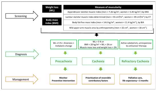 The SCRINIO Working Group proposed simpler criteria based on the loss of at least 10% of body weight and the presence of one of the associated symptoms (fatigue, anorexia, or early satiation) []. These criteria allow ready identification of patients with cancer cachexia and classification as precachexia or cachexia []; this practical approach has improved applicability [].