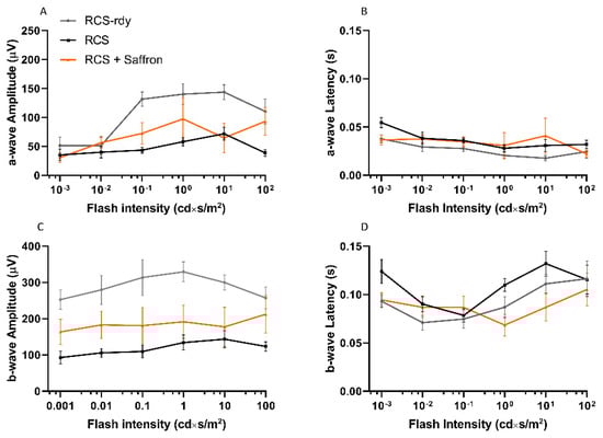 Impact of the Royal College of Surgeons Rat (RCS)Saffron treatment on the flash electroretinogram response. (A–D) Light dependent responses from P30 rats (n = 9). No treatment-related significant differences were found in a- or b-wave amplitudes or in their related latencies. Neuroprotective properties of saffron seem to have been overcome by an extreme severity of this retinal dystrophy. (±SEM; Statistical tests two-way ANOVA followed by Dunnett’s test).