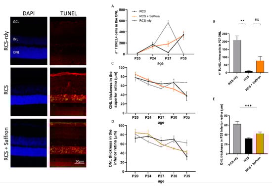 Impact of the Royal College of Surgeons Rat (RCS) Saffron treatment on TUNEL-positive cells in the outer nuclear layer (ONL) during retinal development. Representative pictures of nuclei-stained retinal layers (DAPI) and dying photoreceptors (TUNEL technique) at P30. (A) TUNEL+ cell count at different developmental stages (B) TUNEL+ cell count at P27. (C,D) Means of ONL thickness at different developmental stages in superior and inferior retina, respectively. (E) Bar graph of ONL thickness at P35 in inferior retina. (n = 4; ±SEM; Statistical tests: two-way ANOVA followed by Dunnett’s test) significance indicator: n.s. p > 0.05; ** p < 0.01; *** p < 0.001.