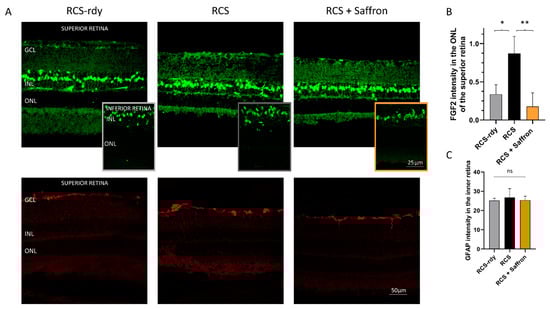 It is well known that Müller cells have an essential role in supporting and resolving conditions of retinal stress. In particular, they are highly sensitive to retinal injury and immediately express increased levels of glial fibrillary acidic protein (GFAP). Therefore, this molecule has been considered an early marker of retinal stress [,]. Müller cells release trophic factors, such as the Fibroblast growth factor 2 (FGF2) to photoreceptors, as well as proinflammatory cytokines. In RCS rats, Müller cells are involved in compensatory pathways, which trigger an increase in their number, hypertrophy, and GFAP expression around P30 []. Figure 3A shows representative images of transversal superior retinal sections immuno-labeled for FGF2 (green) and GFAP (red) expressed by Müller cells. The saffron treatment significantly reduces the FGF2 released in the ONL in the superior retina (see Figure 3B). The GFAP analysis does not present similar differences (see Figure 3C).