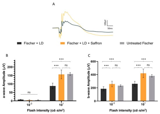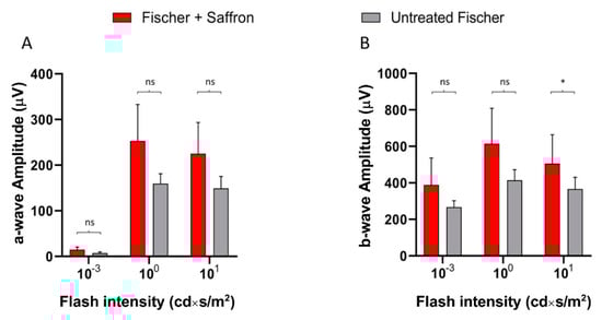 Fischer-344 albino rats present spontaneous age-related dystrophy, which targets many tissues such as the cornea, renal tubules, and vascular internal laminae [,]. Furthermore, several studies describe retinal age-dependent impairments with a progressive reduction in visual evoked potential amplitude and electroretinographic responses [] as well as a continuous loss of photoreceptors in the peripheral retina [] probably due to Müller cell dysfunction []. On the other hand, Sprague Dawley (SD) albino rats do not present any spontaneous degenerative process and have mainly been used as a simplified AMD model where retinal degeneration is induced by light exposure. Photoreceptor death is caused by oxidative stress (photooxidation of membrane lipids). Fischer-344 rats are also albino, and supposedly retinal degeneration is induced by exposure to high-intensity light as in SD. We wonder whether saffron treatment after LD has the same efficacy in SD and Fischer-344 rat retina. Figure 4 shows the a- and b-wave responses in dark-adapted flash ERG recordings, in Fischer rats, following the same protocol developed in SD, of the LD and saffron treatment groups []. After 15 days of recovery, saffron can preserve both a- and b-wave in Fischer rats with particular efficiency for the a-wave as shown at high-intensity flashes (Figure 4 B:10 cd*s/m2).