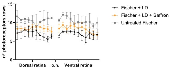 Photoreceptors rows. Count of photoreceptor rows in the superior and inferior retina in control and treated and untreated light damage (LD) Fischer rats (rats n = 6 each group; ±SEM; Statistical tests: TWO way ANOVA followed by Dunnett’s test. Fischer + LDvsFischer + LD + Saffron p < 0.001; Fischer + LDvsUntreatedFischer p < 0.001).