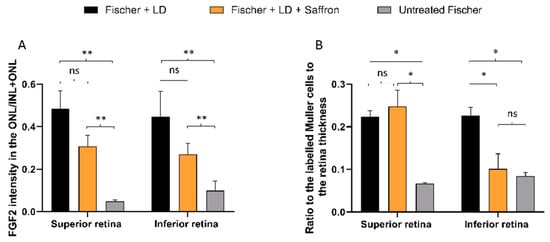 FGF2 and GFAP modulation by Saffron treatment of Fischer rats. (A) Quantification of FGF2 positive pixels in the ONL respective to the total amount in the retina layers. The graph bar shows no significant reduction of the FGF2 expression in treated rats (orange) compared to the LD control (black). (B) Quantification of GFAP positive Müller cell branches normalized to retinal thickness. The graph bar shows a significant reduction of the GFAP ratios in the inferior retina of Fischer treated rats (orange) compared to the relative LD control (black). (n = 6; ±SEM; Statistical tests: One way ANOVA followed by Dunnett’s test) significance indicator: n.s. p > 0.05; * p < 0.05; **p < 0.01.
