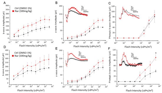 Naringenin preserves retinal function in older C57BL/6J mice. (A–C): Retinal function tested by recording scotopic and photopic ERG in 9-month-old mice treated with naringenin 100 mg/kg/day for three months. The curves show the amplitude respectively of scotopic b-wave (A) and a-wave (B) and photopic b-wave (C); (D–F): Retinal function tested by recording scotopic and photopic ERG in animals of 12 months treated with naringenin 100 mg/kg/day for six months. The curves show the amplitude respectively of scotopic b-wave (D) and a-wave (E) and photopic b-wave (F). The values shown represent the mean ± SEM; n = 6 for each group; Wilcoxon-Mann-Whitney Test statistical analysis (* p ≤ 0.05).