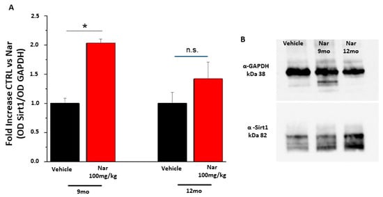 Naringenin preserves the levels of Sirt1 in older C57BL/6J mice. (A) The bar graph shows that naringenin treatment is able to preserve the levels of Sirt1. This increase is significant in the animals treated for three months (red bar) respective to the relative control (black bar); in the animal treated for six months (red bar) this increase is again present although it does not reach statistically significant values. (B) Representative example of a single western blotting experiment. The values shown represent the mean ± SEM; n = 3 for each group; Wilcoxon-Mann-Whitney Test statistical analysis (* p ≤ 0.05).