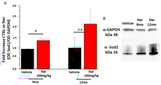 Naringenin preserves the levels of Sod1 in older C57BL/6J mice. (A) The bar graph bar shows that naringenin treatment is able to preserve levels of Sod1. This increase is significant in both groups of animals treated for three or six months (red bar), respective to the relative control (black bar). (B) Representative example of a single western blotting experiment. The values shown represent the mean ± SEM; n = 3 for each group; Wilcoxon-Mann-Whitney Test statistical analysis (* p ≤ 0.05).