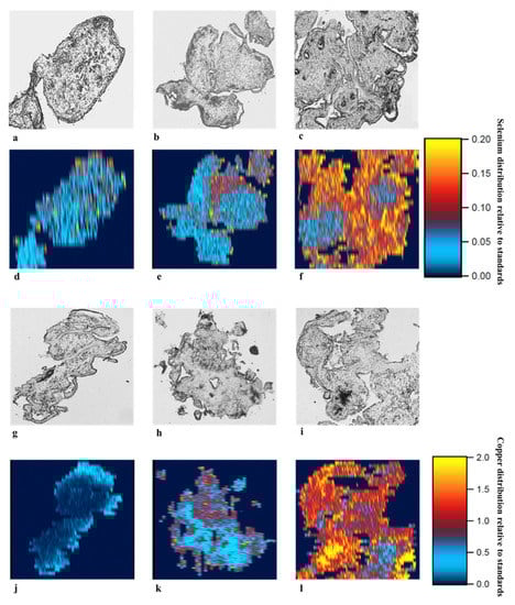 Qualitative assessment of micronutrient distributions with laser ablation inductively coupled plasma-mass spectrometry (LA-ICP-MS) element imaging showed that supplementation with selenium and copper increased the content of these micronutrients in the placenta explants confirming the micronutrient uptake by explants from the media supplemented with selenium and copper (Figure 1; Supplementary Figures S1 and S2). In all three placentas, highest uptake of selenium was found in tissues treated with supraphysiological concentration of sodium selenite (1.6 µM) indicated by more red and yellow pixels in the LA-ICP-MS images (Figure 1d–f, Supplementary Figure S1d–f,j–l). In two placentas, it was apparent that with increasing selenium concentration, there was an increased uptake of selenium on the 2D map (Figure 1d–f and Supplementary Figure S1j–l). Assessment of tissues treated with copper (II) sulfate showed that control tissues had the lowest level of copper visualised by dark and light blue pixels. All tissues supplemented with physiological concentration (20 µM) copper (II) sulfate and two tissues supplemented with supraphysiological concentration of copper (II) sulfate (40 µM) (Figure 1j–l; Supplementary Figure S2d–f,j–l) had a higher content of copper compared to the control. This method was not able to assess iodine uptake.