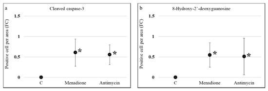 Effect of menadione and antimycin on apoptosis and DNA damage in first trimester human placental explants. Explants from 7–12 weeks of gestation (n = 12) were cultured for 5 days in media with 10% v/v FBS and 1% v/v Antibiotic-Antimycotic and then treated with 120 µM menadione, 480 µM antimycin or 0.1% ethanol (vehicle control) for 24 h. Immunohistochemical labelling for (a) apoptosis (cleaved caspase-3) or (b) DNA damage (8-hydroxy-2’-deoxyguanosine) was performed. Eight randomly selected regions per explant were used for quantification and statistical analyses. Data are presented as a fold change (FC) relative to control ± standard error. Statistical significance was assessed using Generalised Estimating Equations with independence correlation structure with log 2-transformed positive stain per area to estimate fold change compared to controls followed by pre-specified post-hoc Bonferroni adjusted multiple comparisons. * Indicates statistically different (p < 0.05) from control.