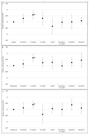 Both concentrations of sodium selenite 0.8 µM (−0.4, 95% CI: −0.6, −0.16) and 1.6 µM (−0.65, 95% CI: −1.27, −0.02), potassium iodide 0.5 µM (−0.42, 95% CI: −0.83, −0.02), 1 µM (−0.43, 95% CI: −0.85, 0.01), and the combination of 0.8 µM sodium selenite and 0.5 µM potassium iodide (−0.73, 95% CI: −1.18, −0.29) reduced DNA damage compared to control (sterile MilliQ water) following 72 h of treatment (p < 0.05) (Figure 5a). However, the effect of the combination of sodium selenite and potassium iodide was not significantly different from individual supplementation with sodium selenite or potassium iodide (p > 0.05) (Figure 5a). There was a significant increase in DNA damage in cells treated with super physiological concentration of copper (II) sulfate (0.63, 95% CI: 0.17, 1.09) (Figure 5a).