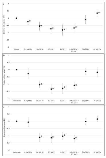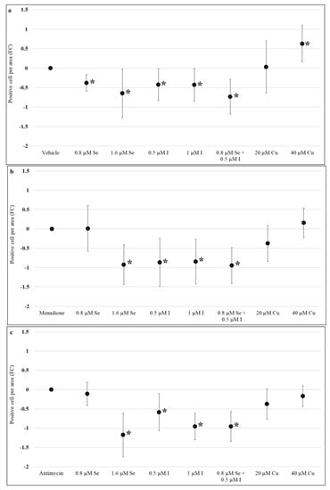 Assessment of apoptosis following induction of oxidative stress by menadione showed that 1.6 µM sodium selenite (−1.04, 95%CI: −1.25, −0.84), both 0.5 µM (−1.34, 95%CI: −1.64, −1.04) and 1 µM potassium iodide (−1.28, 95%CI: −1.65, −0.91), and the combination of 0.8 µM sodium selenite and 0.5 µM potassium iodide (−1.1, 95%CI: −1.32, −0.84) were associated with a significant reduction in apoptosis (p < 0.05) when compared to the menadione alone control (Figure 4b). Combination of sodium selenite and potassium iodide reduced apoptosis more than 0.8 µM sodium selenite (p < 0.05) but not more than potassium iodide (0.5 µM) alone (Figure 4b). Copper (II) sulfate did not significantly impact apoptosis (p > 0.05) (Figure 4b). Similar results were seen when oxidative stress was induced using antimycin (Figure 4c), that is, reduction in apoptosis with the higher dose of sodium selenite (1.6 µM), both potassium iodide concentrations (0.5 and 1 µM) and sodium selenite and potassium iodide combination but no changes in apoptosis with copper (II) sulfate compared to the antimycin alone control (Figure 4c).