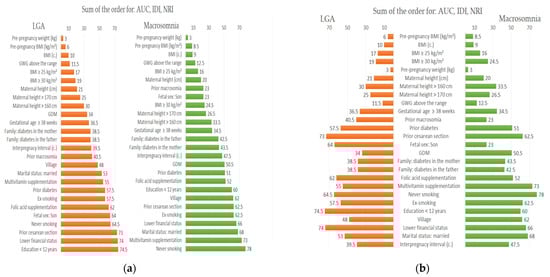 Figure 2 shows a new order of significance (ranking positions) of macrosomia and LGA predictors after summing up of the sequences obtained in the analyses of the three measures (AUC, IDI and NRI). The shorter the horizontal bar, the higher the position in the ranking of predictors. The (a) image shows those clinical factors that best improved predicting (ranking 1st in the sequences). The (b) image highlights differences between LGA and macrosomia for each predictor.