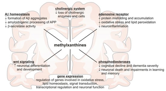 Summary of the molecular mechanisms reported in recent literature potentially mediating the beneficial effects of methylxanthines in respect to Alzheimer´s disease.
