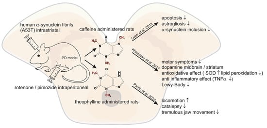Older studies have already demonstrated neuroprotective effects of caffeine in PD mouse models []. In line with these previous encouraging results, Luan et al. demonstrated that chronic caffeine treatment reduced the effect of intra-striatal injected human A53T α-Synuclein fibrils in mice []. Caffeine was administered seven days before the injection and applied for 120 days at concentrations of ~0.4–2 mg/L. They found significantly decreased inclusion of α-Synuclein in the striatum of the caffeine treated mice. Furthermore, apoptosis, microglial activation and astrogliosis were significantly reduced []. A similar study used 52 rats with a control group, a PD model group—generated by injecting 1.5 mg/kg rotenone intraperitoneally (i.p.) for 45 days—and two caffeine groups. One of the caffeine groups was injected with 30 mg/kg caffeine i.p. in addition to the administered rotenone for 45 days, whereas the other group was treated with caffeine after the induction of PD via rotenone. The study revealed that co-treatment and post-treatment with caffeine in the intoxicated rats enhanced the dysfunction of rotenone-induced motor symptoms by recovering dopamine levels in the midbrain and striatum. In addition, caffeine improved the antioxidant effect by reducing rotenone-induced lipid peroxidation and superoxide dismutase activity in the striatum and midbrain. Furthermore, the data revealed reduced rotenone-induced TNF-α activity in the caffeine groups indicating an anti-inflammatory effect of caffeine. Caffeine protection and treatment restored open field test parameters, forelimb hanging test and traction test to nearly control group values. Histopathological investigation revealed a degeneration of neurons and presence of Lewy bodies in the rotenone-induced PD group, which was prevented in both caffeine groups with a more prominent effect in the caffeine protected group []. Pardo et al. demonstrated in another animal study that the naturally occurring methylxanthine theophylline can reverse motor symptoms in rats. In this study theophylline reversed locomotion, catalepsy and tremulous jaw movement (resembling parkinsonian tremor) induced by pimozide, a D2 dopamine antagonist []. In conclusion, these studies show a link for caffeine and other methylxanthines acting as A2A receptor antagonists with a decreased risk for PD and modification of progression, indicating new adenosine receptor ligands might be encouraging targets in treating PD. In a study by Rohilla et al. newly synthesized xanthine derivates as selective AR antagonists were analyzed. Evaluation of the antiparkinsonian effect in the study was carried out by inducing catatonia in rats with perphenazine. Most xanthines significantly lowered the catatonic score compared to control. The most potent antiparkinsonian effect was found for the methylxanthine RB-531 (8-[3-(3-Chloropropxy)]-1,3-dipropyl-7-methylxanthine), showing a similar response as the standard treatment L-DOPA []. The abovementioned studies and their outcomes are summarized in Figure 2 and Table 4.