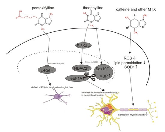 Although no clear association between methylxanthines and the risk for MS has been reported, animal studies with caffeine have shown an interesting therapeutical potential of methylxanthines in respect to MS, as summarized in Figure 3 and Table 6. One study demonstrated the neuroprotective effect of caffeine in experimental autoimmune encephalomyelitis (EAE) rats. An adenosine receptor mediated shift from Th1 to Th2 cell cytokine function revealed caffeine as a potential immunomodulatory drug []. A more recent study by Duman et al. discovered that theophylline enhanced CNS and PNS remyelination by increasing HDAC2, SOX10 and MBP protein levels in young adults and old mice after inducing a focal demyelinating lesion in the spinal cord. The increased remyelination efficiency of theophylline only occurred in the lesion site []. Ruiz-Perera et al. also discovered a potential link between methylxanthines and MS. In their study, the authors found that pentoxifylline completely shifted human neuronal stem cells to the oligodendroglial fate by inhibiting the c-REL pathway [].