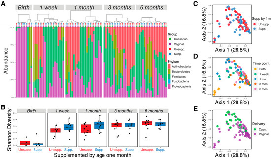 3.3. Changes in Microbial Communities Associated with Supplementation by 1 Month of Age