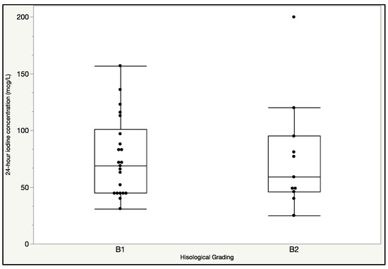 24-h urinary iodine concentration (UIC) boxplot and scatter plot in patients with B1 [72 (45/88) μg/L] and B2 [63 (44.5–105) μg/L]) grading at T0 (p = ns).