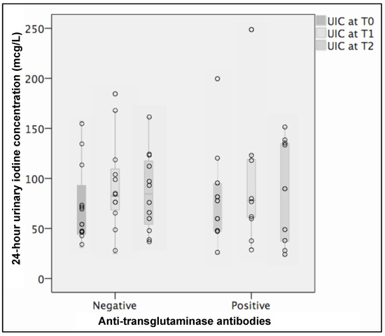 Anti-tTG tests were still positive in 10 patients (43.5%) and UIC was not different between patients with positive and negative tests. In patients with positive celiac tests, UIC was 68 μg/L (44.5/101.2 μg/L) at T0 and 102 μg/L (34.5/135.7 μg/L) at T2 (p = ns), while in patients with negative celiac tests it was 52 μg/L (44.0/93.0 μg/L) at T0 and 76 μg/L (54.0/117.5 μg/L) at T2 (p = ns). Figure 2 displays the UIC at T0, T1, and T2.