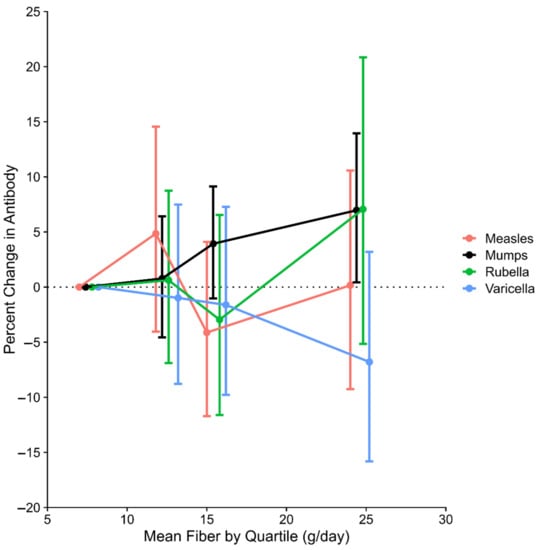 Modification of antibody response by fiber could vary according to type of vaccine or natural infection, but to our knowledge no other data address this. Studies of prebiotics—a type of dietary fiber—provide some relevant information. The effect of prebiotics on the response to the vaccine for influenza has been studied more than for other vaccines, with 212 clinical trial subjects included in a recent meta-analysis [8]; the results for antibodies to influenza antigen A/H1N1 were heterogeneous but most studies showed an increase of roughly 30–50%. The other two antibodies examined in the meta-analysis, to other strains of influenza, also had higher antibody concentrations with prebiotic use, but the results were not statistically significant. Trials of prebiotics among infants have shown no benefit for a variety of vaccine-induced antibodies [25,26,27,28]. Other relevant data are discussed in Supplementary Materials Section S3. Among the reports we identified, none examined antibodies to Mumps.