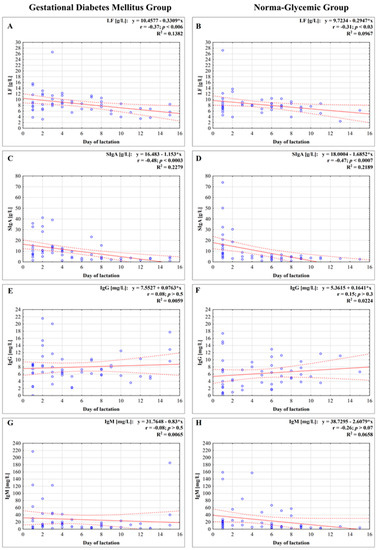 | LF and Immunoglobulins | Stage of Lactation | Group | p-Value GDM G1 vs. Normoglycemic | p-Value GDM G2 vs. Normoglycemic | p-Value GDM G1 vs. GDM G2 | ||