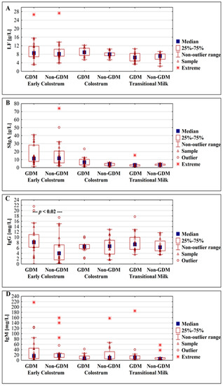 Chicago/Turabian StyleLis-Kuberka, Jolanta, Marta Berghausen-Mazur, and Magdalena Orczyk-Pawiłowicz. 2021. "Lactoferrin and Immunoglobulin Concentrations in Milk of Gestational Diabetic Mothers" Nutrients 13, no. 3: 818. https://doi.org/10.3390/nu13030818