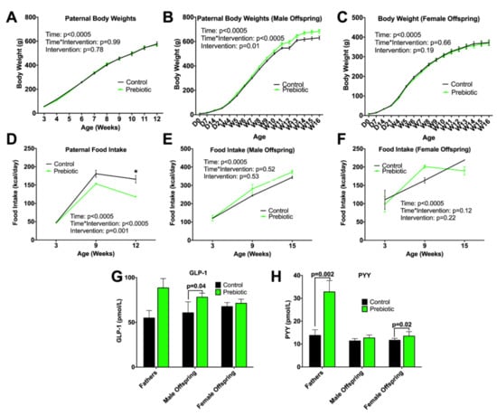 As expected, there was a significant main effect of time for food intake with intake increasing as the fathers, male offspring and female offspring aged (p < 0.0005; Figure 1). There was also a significant interaction between time and diet among fathers, with prebiotic fathers consuming significantly fewer kcal/day at 12 weeks of age (p < 0.0005; Figure 1D). No difference in food intake was observed in male or female offspring (Figure 1E,F).