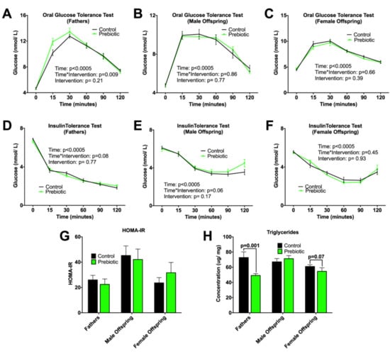 To determine whether paternal prebiotic intake affected metabolic outcomes intergenerationally, we conducted insulin and glucose tolerance tests. An OGTT measures the animal’s response to an oral glucose load, wherein, persistently elevated blood glucose levels reflect glucose intolerance [20]. During an ITT, lower glucose values over the 120 min test reflect greater insulin sensitivity [20]. There was a significant interaction between time and diet for glucose tolerance in fathers (Figure 2A). Due to the significant sex effect seen within both the OGTT and ITT (p < 0.0001), male and female adult offspring were assessed separately. No differences were observed in glycemia or insulin sensitivity in male and female offspring (Figure 2B,C,E,F). Similarly, no difference was seen in insulin resistance in fathers or adult offspring as determined by HOMA-IR (Figure 2G). We did, however, find intergenerational differences in hepatic triglyceride concentrations. Prebiotic fathers showed reduced hepatic triglyceride concentration compared to control (p = 0.001), which persisted in adult female offspring as a trend towards a decrease (p = 0.07) (Figure 2H).