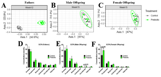 Fecal microbiota comparisons of fathers fed prebiotic or control diet and the intergenerational similarities in male and female offspring. Beta diversity of (A) paternal at 12 weeks of age, (B) male offspring and (C) female offspring at 15 weeks of age, calculated with principal coordinates analysis (PCoA) using a Bray–Curtis distance matrix. Cecal short chain fatty acids in: (D) fathers, (E) adult male offspring and (F) adult female offspring at euthanasia. Values are means ± SEM, n = 8–13 (p < 0.05).