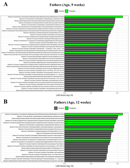 Fecal microbiota comparisons using a LEfSe tool of fathers fed prebiotic or control diet. (A) fathers at 9 weeks of age, (B) fathers at 12 weeks of age.