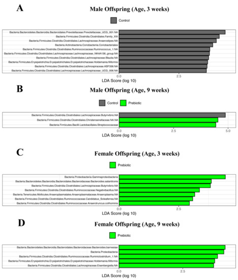 Fecal microbiota comparisons using a LEfSe tool of male and female offspring sired from fathers fed prebiotic or control diets for 9 weeks. (A) male offspring at 3 weeks of age, (B) male offspring at 9 weeks of age, (C) female offspring at 3 weeks of age, (D) female offspring at 9 weeks of age.