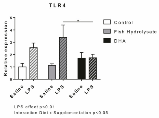 We first evaluated the expression of LPS receptor, TLR4. As expected, LPS increased TLR4 expression (F(1,27) = 13.36, p = 0.011) but no significant effect of both supplementations were observed. However, the interaction between LPS and supplementation was significant (F(2,27) = 3.61, p = 0.0407). DHA supplementation reduced the LPS-induced expression of TLR4 compared to the fish hydrolysate supplementation (p = 0.0163) (Figure 1).