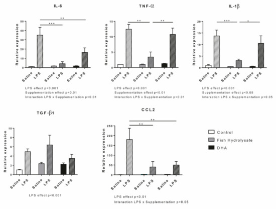 Figure 2. Expression of pro- and anti-inflammatory cytokines (IL-6, TNF-α, IL-1β, TGF-β1) and chemokine (CCL2) in the hippocampus of mice fed orally with control solution (in white), fish hydrolysate (in grey) or DHA (in black) by daily gavage for 18 days, 2 h following LPS injection (125 µg/kg) (hatched bars) (* p < 0.05, ** p < 0.01, *** p < 0.001 by 2-way ANOVA and Fisher’s LSD post-hoc test; n = 4–6 per group). Data are presented as mean ± SEM. DHA: docosahexaenoic acid; LPS: lipopolysaccharide.