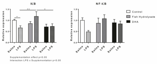 Finally, we examined protein expressions of IκB and NF-κB involved in the regulation of the expression of these inflammatory factors (Figure 3). No significant effect of LPS was observed on both factors. The supplementations affected the protein expression of IκB (F(2,27) = 3.41, p = 0.0479) and an interaction between supplementation and LPS was revealed only for IκB (F(2,27) = 4.03, p = 0.0293). Thus, in inflammatory condition, the protein expression of IκB was significantly increased by the fish hydrolysate supplementation as compared to the DHA supplementation (p = 0.0141) and to the control group (p = 0.0054).