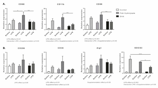 Figure 4. Expression of M1 (A) (CD68, CD11b and CD86) and M2 (B) (CD206, CD36, Arg1 and SOCS3) microglial markers in the hippocampus of mice fed orally with control solution (in white), fish hydrolysate (in grey) or DHA (in black) by daily gavage for 18 days, 2 h following LPS injection (125 µg/kg) (hatched bars) (* p < 0.05, ** p < 0.01, *** p < 0.001 by 2-way ANOVA and Fisher’s LSD post hoc test; n = 4–6 per group). Data are presented as mean ± SEM. DHA: docosahexaenoic acid; LPS: lipopolysaccharide.