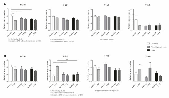 Figure 5. Gene (A) and protein (B) expression of neurotrophins (BDNF, NGF) and their receptors (TrkB and TrkA) in the hippocampus of mice fed orally with control solution (in white), fish hydrolysate (in grey) or DHA (in black) by daily gavage for 18 days, 2 h following LPS injection (125 µg/kg) (hatched bars) (* p < 0.05, ** p < 0.01, *** p < 0.001 by 2-way ANOVA and Fisher’s LSD post-hoc test; n = 4–6 per group). Data are presented as mean ± SEM. DHA: docosahexaenoic acid; LPS: lipopolysaccharide.