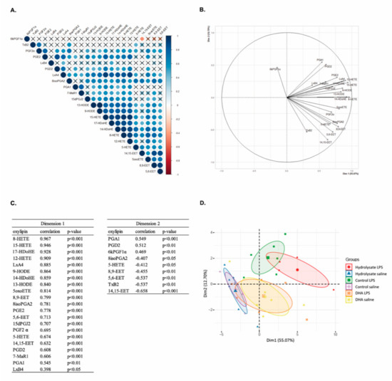 Figure 6. Multivariate analysis of oxylipins in the hippocampus of mice fed orally with control solution, fish hydrolysate or DHA by daily gavage for 18 days, 2 h following LPS injection (125 µg/kg). (A) Correlation matrix of the 23 oxylipins (blue: positive correlation, red: negative correlation, X: no significant correlation). (B) Correlation circle from PCA. (C) Correlation between each variable and the principal component score from PCA (dimension 1 or dimension 2). (D) Individual map of PCA. 5-oxoETE: 5-oxo-eicosatetraenoic; 7-MaR1: 7(S)-maresin; EET: epoxy-eicosatrienoic acid; HDoHE: hydroxy-docosahexaenoic acid; HETE: hydroxy-eicosatetraenoic acid; HODE: hydroxy-octadecadienoic acid; Lx: lipoxin; PCA: principal component analysis; PG: prostaglandin; TxB2: thromboxane B2.