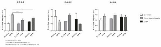 Figure 7. Expression of oxylipin biosynthesis enzymes (COX-2, 15-LOX and 5-LOX) in the hippocampus of mice fed orally with control solution, fish hydrolysate or DHA by daily gavage for 18 days, 2 h following LPS injection (125 µg/kg) (* p < 0.05, ** p < 0.01 by 2-way ANOVA and Fisher’s LSD post hoc test; n = 4–6 per group). Data are presented as mean ± SEM. DHA: docosahexaenoic acid; LPS: lipopolysaccharide.