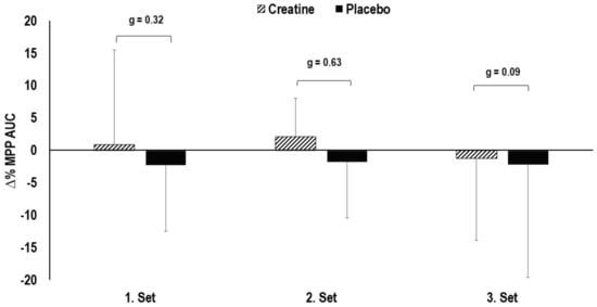 Similarly, total work (i.e., AUC of MPP) in the 3 × 10 repetitions test was assessed by the same method, but using only three time points within groups (i.e., set 1–3). In case of a statistically significant main effect for time or interaction, a Bonferroni post hoc analysis was performed. In case a lack of sphericity was observed in the ANOVA, the Greenhouse–Geisser correction was applied. Statistical significance for all analyses was set at p ≤ 0.5. Effect sizes (g) were calculated in order to evaluate the effects of the intervention phases using Hedges g, with g < 0.2 being no effect, g between 0.2 and 0.5 being a small effect, g between 0.5 and 0.8 being a medium effect, and g > 0.8 being a large effect [23,24]. They were calculated for between-condition comparisons, even in the absence of statistical main effects.