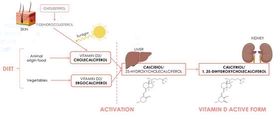 Vitamin D is a fat-soluble prohormone that plays an essential role in bone mineral metabolism, being involved in calcium and phosphorus metabolism and skeletal homeostasis. The main source of vitamin D is cholecalciferol or vitamin D3, synthesized by sunlight on the skin from 7-dehydrocholesterol, for which cholesterol is a precursor []. It is also available in the diet from animal (cholecalciferol) and vegetable (ergocalciferol) foods. Regardless of the source, vitamin D requires two hydroxylations in the organism to become biologically active, the first in the liver and the second in the kidney, resulting in the form known as 1,25(OH)2 vitamin D or calcitriol (Figure 1) [].