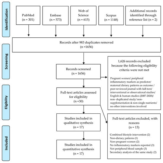 This review was guided by the Preferred Reporting Items for Systematic Review and Meta-Analyses (PRISMA). Articles were sourced from 4 databases, namely, EMBASE, PubMed, Web of Science, and Scopus. The literature search was undertaken in September 2018 and updated in May 2020. The search strategy was adapted for each database using keywords as follows: inflammation OR “inflammatory markers” AND pregnancy OR “pregnant women” AND diet OR “dietary patterns.” No restrictions or filters were applied to the search in the title, abstract, or keywords. Two reviewers (K.Y. and A.K.) independently performed the screening of titles and abstracts, followed by full-text assessment as needed.