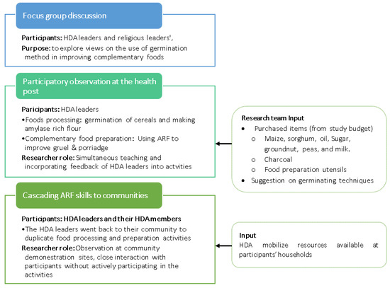 The transformative research paradigm guided the study. The rationale for choosing this paradigm was the overall intentions of the research of enhancing the complementary foods by promoting and scaling up simple household level technology, the germination, via active community participation. In line with this paradigm, participatory action research informed the study design [41,42]. The study was exploratory qualitative research that used focus group discussions (FGDs) involving HDA leaders and religious leaders separately and participant observation with HDA leaders and their group members. The FGD was conducted with religious leaders to inform our understanding of the religious implication of using germinated cereal flour. Likewise, the FGDs with HDA leaders were intended to examine experiences of ARF use in complementary foods in their communities/groups. The participant observation was used to examine the natural settings and interactions of a typical HDA-led complementary food demonstration (Figure 1).