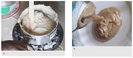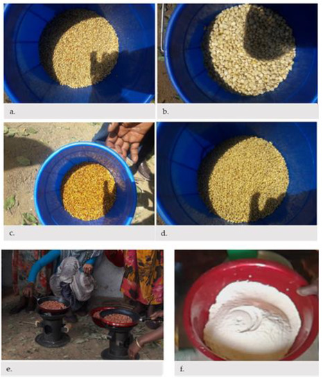 Germination starts by selecting and cleaning whole grains, soaking the grains with an equal amount of water for 12 h, then draining and allowing them to germinate for 48 h at room temperature in an airtight plastic container in a cool and dark place. The germinated grains are then sundried by turning regularly, then roasted on a low flame until dry and milled into homogenous flour over four days [19,20]. The flour can be stored in a sealed container for a month [21].