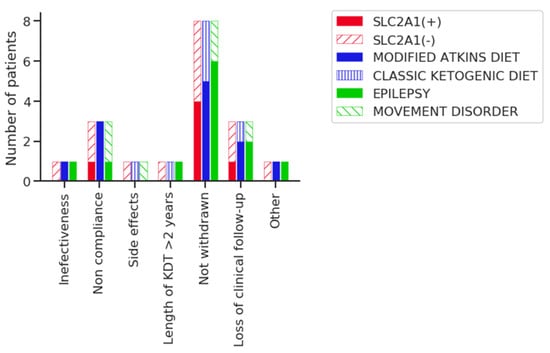 Reasons for withdrawing ketogenic dietary therapies (KDT) according to the SLC2A1 gene mutation, type of KDT, and symptoms.