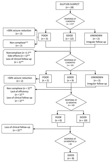 Data of all pediatric patients (<18 years old) who had been prescribed a KDT to treat a confirmed or suspected GLUT1DS in a tertiary care level hospital between January 2009 and August 2020 were collected. A GLUT1DS was suspected in patients with seizures or movement disorders associated with hypoglycorrhachia. The diagnosis was confirmed when SLC2A1 mutations were found.