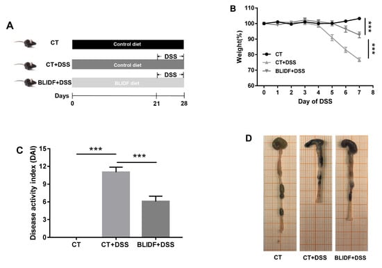 For experiment I, after adaptation for 7 days, 24 mice were randomly divided into three groups: CT group, CT+DSS group, BLIDF+DSS group, 4 mice per cage. The CT and CT+DSS groups were fed a control diet, and the BLIDF+DSS group was fed with BLIDF diet throughout the experiment. After feeding ad libitum for 21 days, 2.5% (w/v) DSS (36,000–50,000 kDa; MP Biomedicals, Solon, OH, USA) in drinking water was administered for 7 days (DSS water was changed every 2 days) in the CT+DSS and BLIDF+DSS groups.