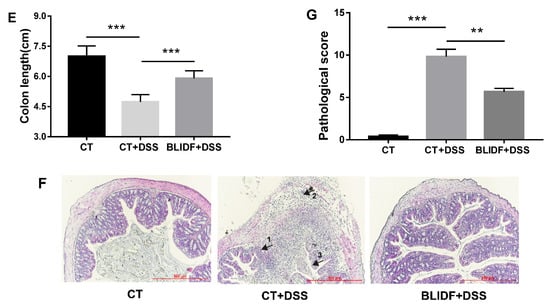 The protective effects of BLIDF against colitis were evaluated in DSS-induced acute colitis in mice (Figure 1A). As expected, a significant body weight loss, elevated DAI score, and colon length shortening were observed in the CT+DSS group (Figure 1B–E). Moreover, inflammatory lesions, including significant and complete goblet cell loss, crypt distortion, and inflammatory cell infiltration, were found in the CT+DSS group (Figure 1F,G). Notably, the weight loss, DAI scores, colon length shortening, and inflammatory lesions in DSS-treated mice were significantly decreased by BLIDF supplementation (Figure 1B–G). These results demonstrate that BLIDF supplementation strikingly alleviated DSS-induced colitis.