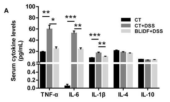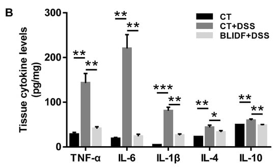 Inflammatory cytokines act as signaling molecules to mediate the inflammatory response in various immune cells [26]. Raised levels of inflammatory cytokines can reflect the severity of gut inflammation to some extent [26]. To evaluate whether the anti-colitis effects of BLIDF were associated with an improvement in the inflammatory responses, several most-detected inflammatory cytokines were quantified in serum and colonic tissue by ELISA. DSS induced a significant increase of pro-inflammatory cytokines (IL-6, TNF-α, and IL-1β) in both serum and colonic tissue of mice, while BLIDF supplementation significantly reduced their levels in DSS-treated mice (Figure 2A,B). Moreover, BLIDF supplementation dramatically attenuated the DSS-induced elevated expression of anti-inflammatory cytokines IL-4 and IL-10 in colonic tissue (Figure 2B). The down-regulation of pro-inflammatory and anti-inflammatory cytokine levels in colitis alleviated mice is consistent with a previous study [27].